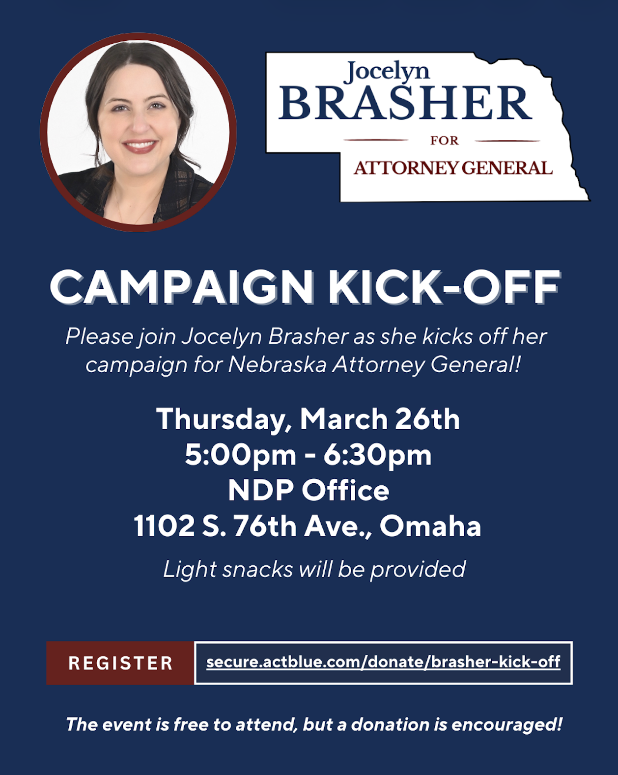 Please join me on Thursday, March 26th, as we celebrate the kick-off of my campaign for Nebraska Attorney General! I would love the chance to meet you, share my vision for the AG's Office, and to hear directly from you about the everyday issues Nebraskans are facing. Whether you’re a Democrat, Republican, Nonpartisan, or simply someone who believes in equal justice and putting people over politics, you’re welcome here!